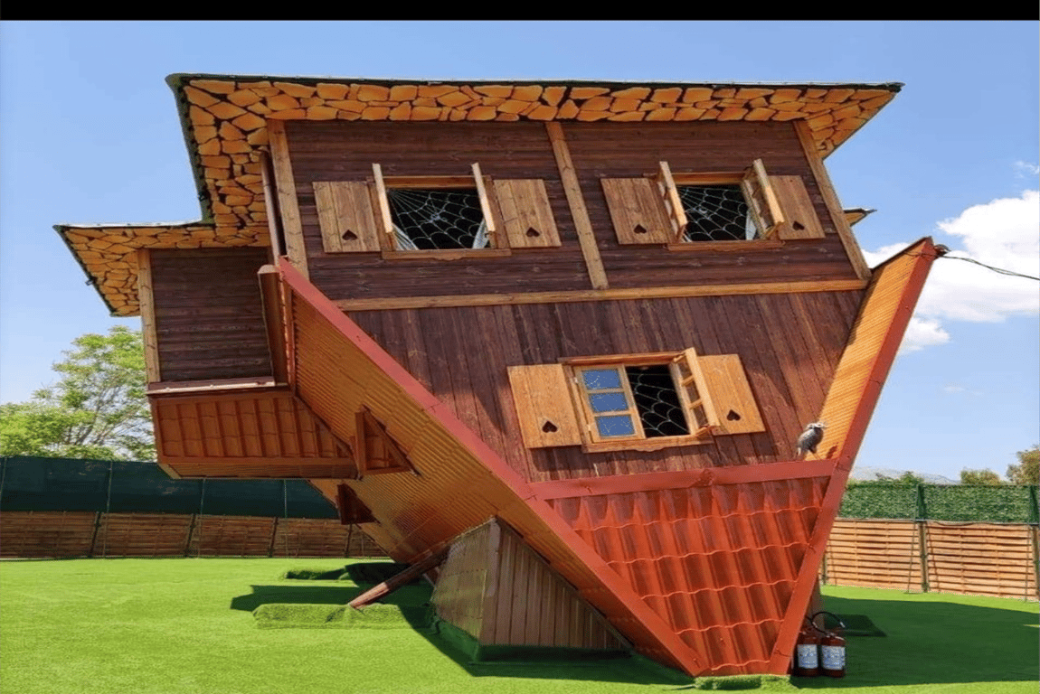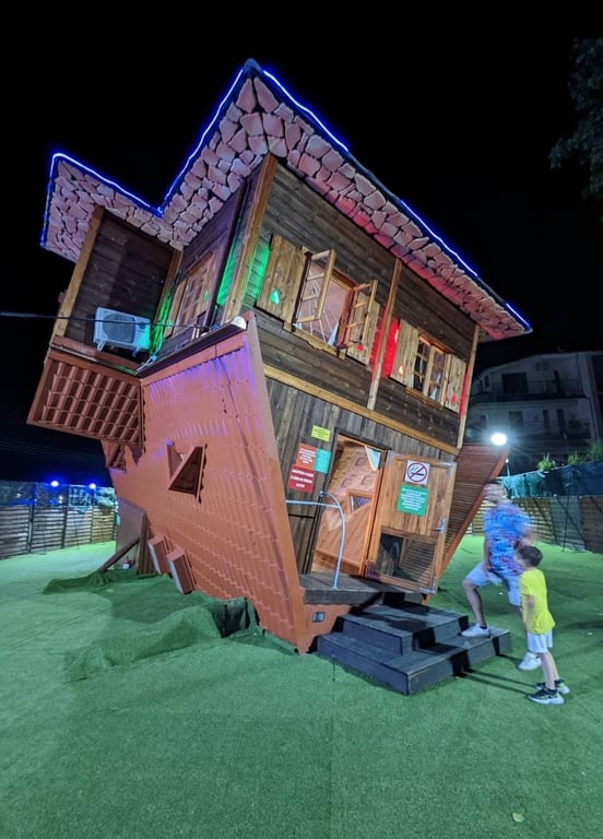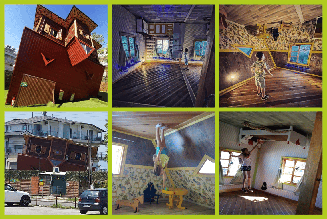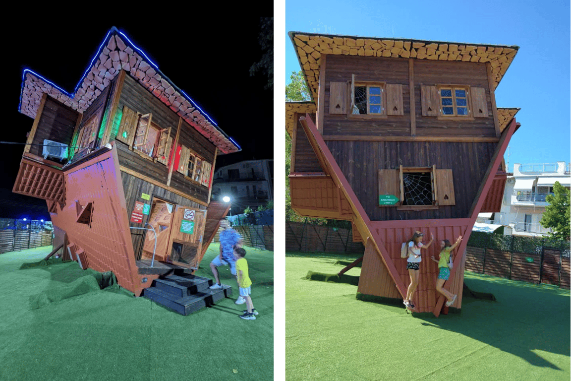 At The Upside Down House in Paralia Katerinis, reality turns on its head — literally.