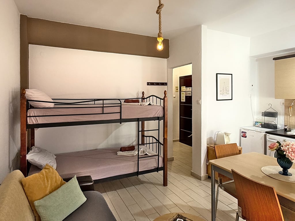 Living space: Cozy living room with a comfortable sofa bed plus a fun bunk bed setup—ideal for kids or extra guests.